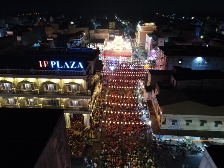 Kanalvisual.com - Rohil, Riau - Gemerlap cahaya lampu lampion menyinari langit Kota Bagansiapiapi. Di antara cahaya lilin dan asap dupa yang menggantung di udara, Bupati Rokan Hilir, Afrizal Sintong dan rombongan berjalan menuju gedung IP Plaza yang berada di jantung kota Bagansiapiapi untuk menghadiri Malam Kesenian dan Peresmian Even Bakar Tongkang tahun 2023