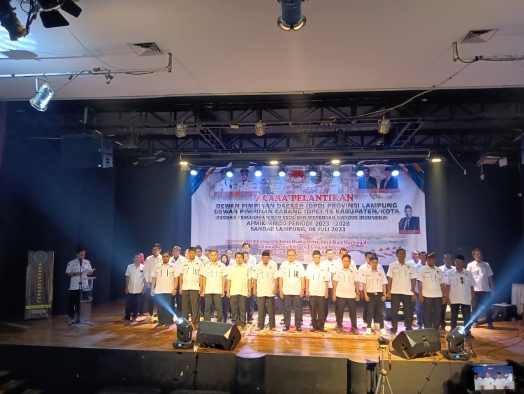 Kanalvisual.com - Bandar Lampung - Bertempat di Gedung Dewan Kesenian Lampung, jajaran Pengurus DPD Asosiasi Pengusaha Mikro Kecil dan Menengah Mandiri Indonesia (Apmikimmdo) Provinsi Lampung dan jajaran Pengurus DPC Apmikimmdo Kabupaten / Kota se-Provinsi Lampung secara resmi Dilantik dan Dikukuhkan, Kamis (06/07/2023).