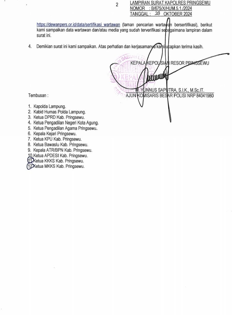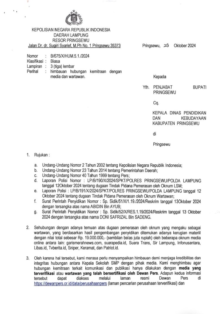 Kanalvisual.com - Bandar Lampung - Menanggapi surat Kapolres Pringsewu, AKBP M. Yunnus Saputra, SIK, M.Sc.IT yang ditujukan kepada Penjabat Bupati Pringsewu Cq. Kepala Dinas Pendidikan Dan Kebudayaan Pringsewu, Kepala Pekon /Lurah Kab. Pringsewu, terkait pengembangan kasus pemerasan terhadap Kakon/Lurah serta himbauan hubungan kemitraan dengan Media dan Wartawan, maka Forum Pers Independent Indonesia (FPII) Provinsi Lampung yang merupakan salah satu Organisasi Pers yang ada di tingkat Nasional dan Provinsi Lampung, bersikap.
