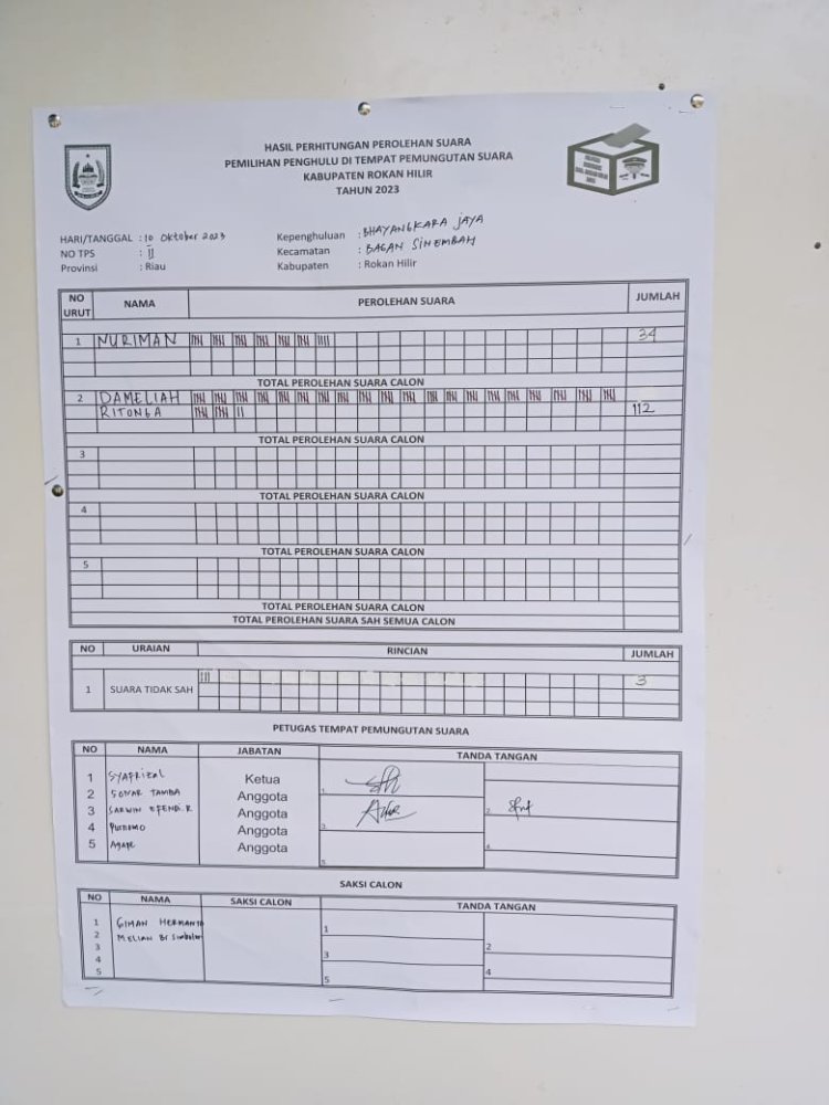 Kanalvisual.com - Rohil, Riau - Pemilihan Penghulu yang diadakan di Kepenghuluan Bhayangkara Jaya, Kecamatan Bagan Sinembah usai sudah. Damelia Ritonga, Kandidat Penghulu dengan nomor urut 2 (dua) menjadi Pemenang, mengalahkan kandidat dengan nomor urut 1 (satu), Nuriman.