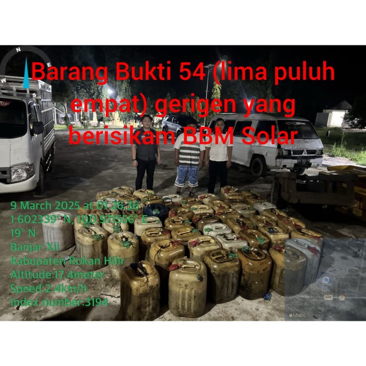 "Selanjutnya dilakukan penghitungan dan diketahui jumlah Bahan Bakar Minyak bersubsidi jenis Bio Solar yang ada di lokasi berjumlah 54 jerigen dan selanjutnya bersama terduga pelaku dibawa ke Polres Rokan Hilir untuk dilakukan pemeriksan lebih lanjut," terang Kasi Humas.