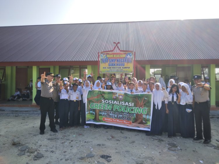 Usai upacara bendera, kegiatan Police Go to School dilanjutkan dengan aksi nyata penghijauan melalui penanaman tiga bibit pohon Matoai di halaman SMPN 6 Siak Hulu sebagai bagian dari implementasi program Green Policing Polsek Siak Hulu — Polres Kampar. Para siswa turut serta aktif dalam prosesi penanaman yang berlangsung semangat dan penuh antusias. Langkah sederhana menanam pohon ini mengandung pesan mendalam: bahwa kepedulian terhadap lingkungan harus dimulai dari langkah kecil, dari halaman sekolah, dari hari ini.