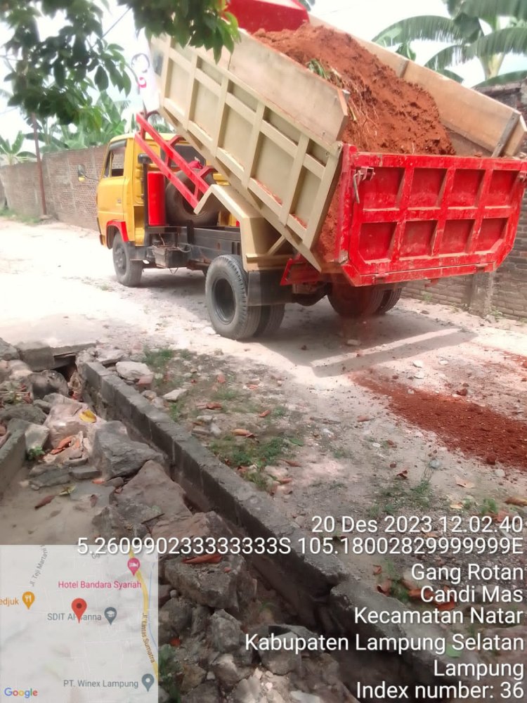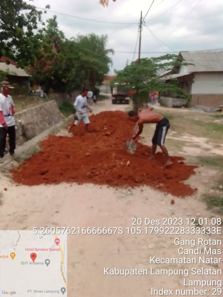 Kanalvisual.com - Lampung Selatan - Relawan Silahturahmi Ganjar Pranowo-Mahfud MD Desa Kalisari, Natar, Kabupaten Lampung Selatan, bergotong-royong menimbun jalan yang rusak di Desa Kalisari sepanjang 500 meter, Desa Candi Emas 300 meeter dan Lapangan Voly di Desa Negara Ratu, Natar, Lampung Selatan, Rabu, 20 Desember 2023.
