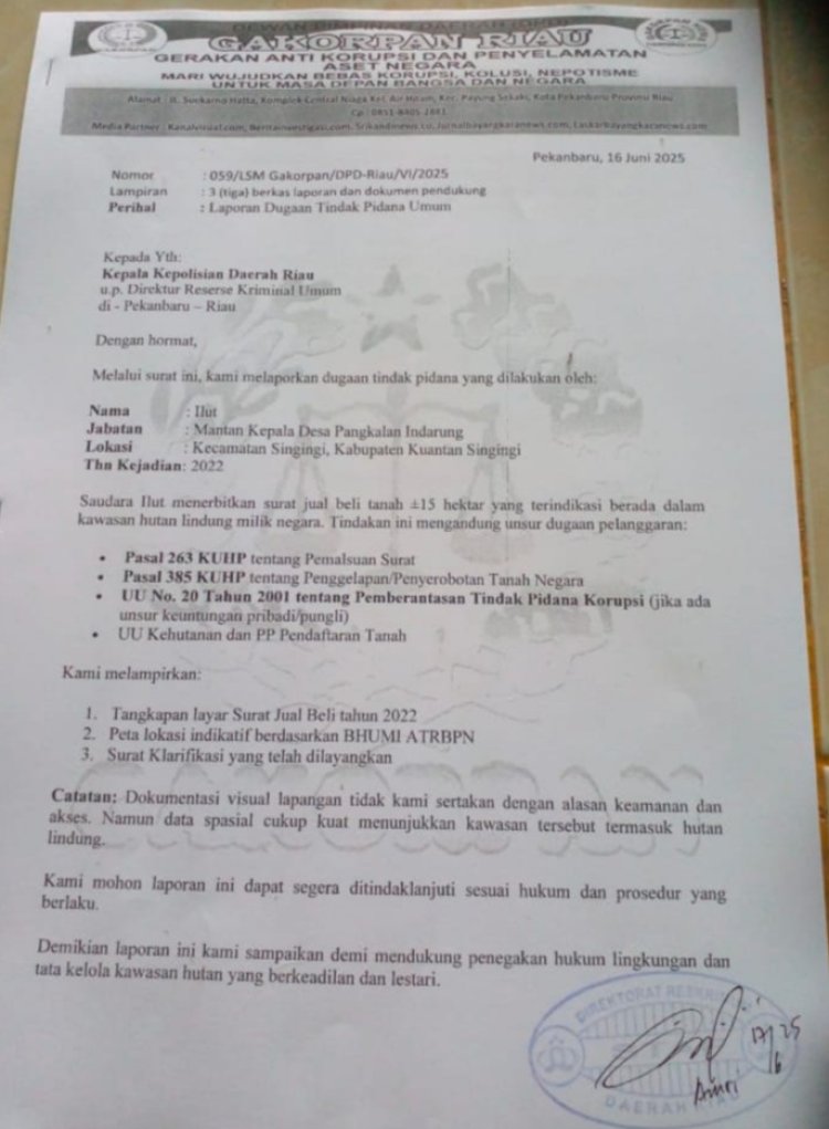 "Laporan kejahatan lingkungan ini sudah kami layangkan di Mapolda Riau. Dimana dalam laporan tersebut, mantan Kades Pangkalan Indarung, saudara Ilut, diduga kuat ikut terlibat langsung dalam praktek jual beli hutan kawasan HPT itu," ungkap Rahmad.