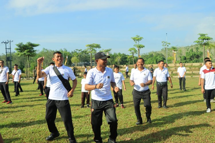 Kanalvisual.com - Tulang Bawang Barat - Forkopimda Kabupaten Tulang Bawang Barat, gelar olahraga bersama TNI-Polri serta jajaran Pemkab Tulang Bawang Barat dalam rangka menyambut HUT Bhayangkara ke-77 bertempat di Lapangan Apel Polres Tulang Bawang Barat, Kamis (15/06/2023).