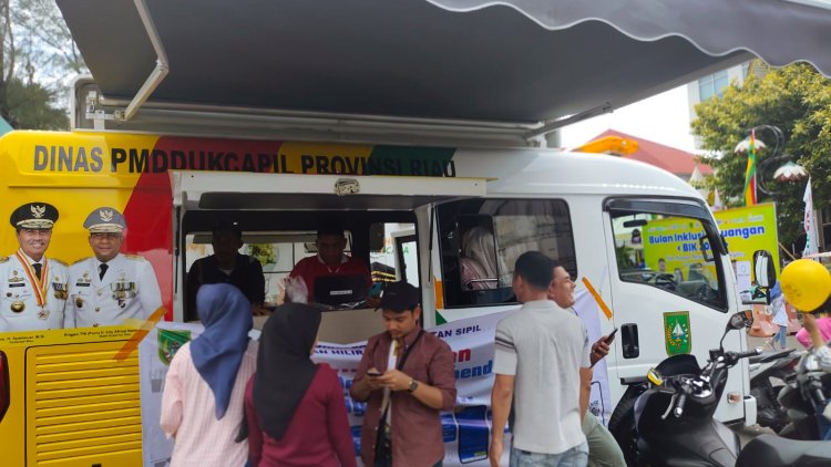 Tampak mobil pelayanan keliling Disdukcapil Rohil di kerumuni masyarakat untuk mendapatkan layanan IKD. Petugas Disdukcapil yakni Administrator Data Base, Darsono dan Firdaus serta Petugas lainnya juga dengan begitu ramah dan sigap melayani warga baik yang melakukan aktivasi maupun yang sekedar ingin bertanya.