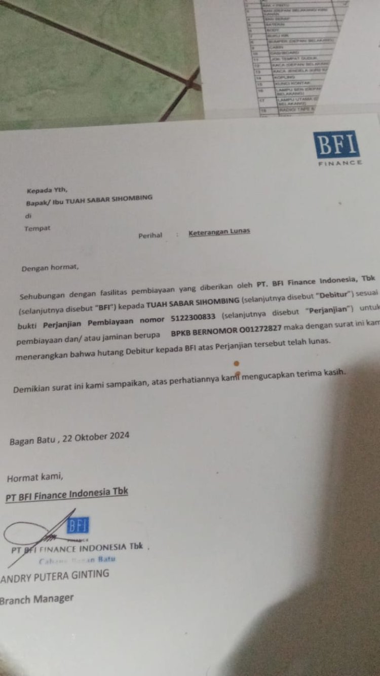Dikonfirmasi oleh Awak Media pada Senin (28/04/2025) melalui pesan chat di WhatsApp (WA), Kepala Cabang BFI Bagan Batu, Andre Ginting, mengatakan, untuk membersihkan nama itu bisa pengajuan ke OJK, karena dari sisi BFI pencatatan yang dilakukan itu sesuai dengan mekanisme pelunasan kontrak. Dimana hasil dari lelang barang tarikan masih ada kekurangan untuk menutup pokok hutang, jadi itu yang di catat di pencatatan OJK.