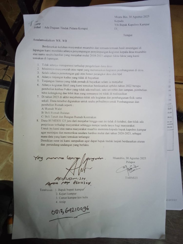 Meskipun Kejaksaan Negeri Kampar tak menanggapi laporan yang disampaikan oleh beberapa orang yang terdiri dari Tokoh Masyarakat, Anggota BPD, Kepala Dusun (Kadus), Ketua RT dan RW, Pemuda, serta Kaur, pada tanggal 20 Maret 2024, kali ini kembali warga melaporkannya ke Polres Kampar, pada Sabtu (30/08/2025).