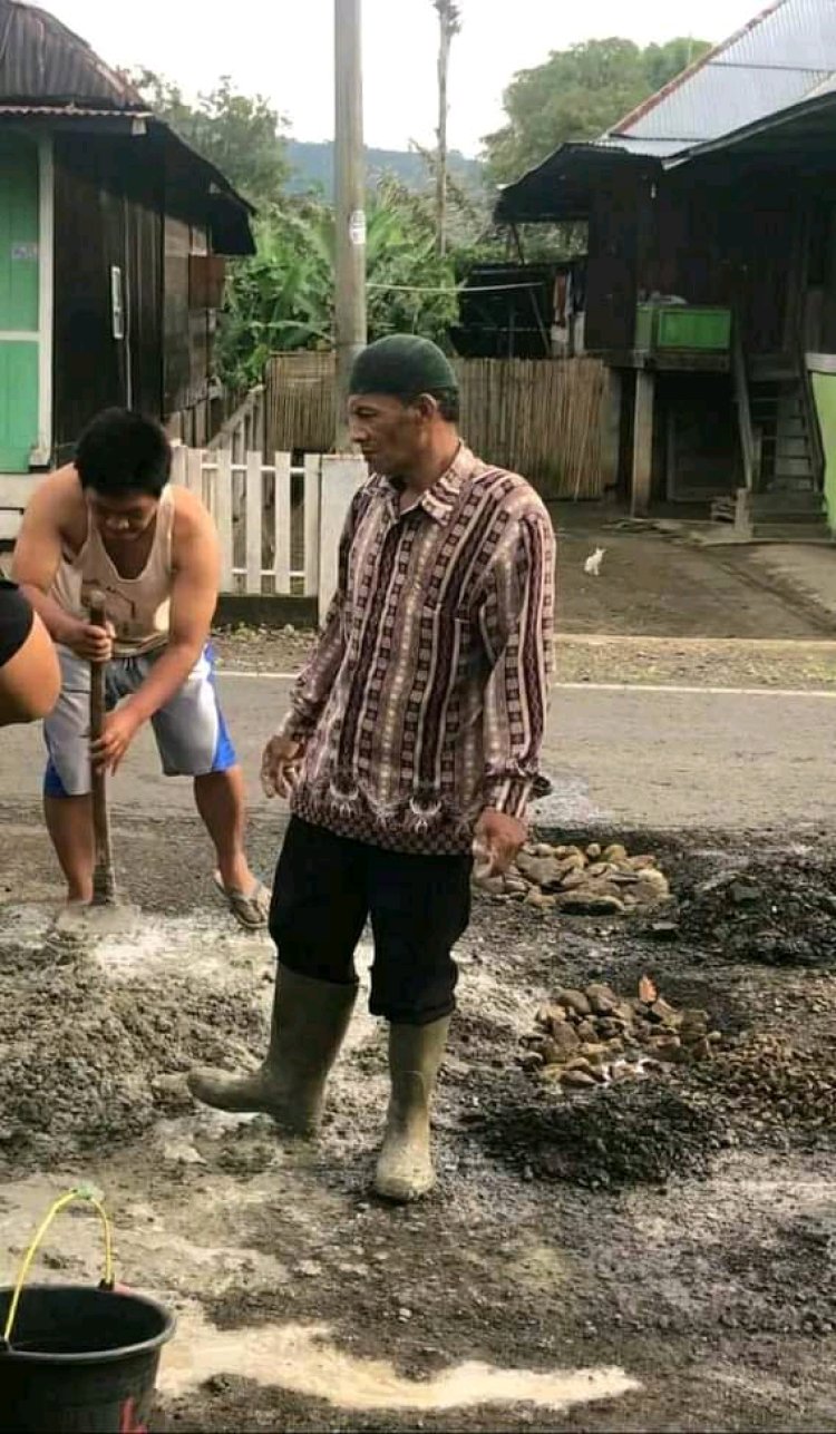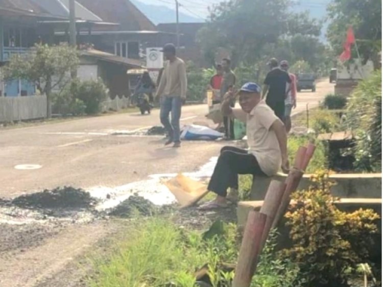 Warga Bergotong Royong Perbaiki Jalan Nasional yang Berlubang